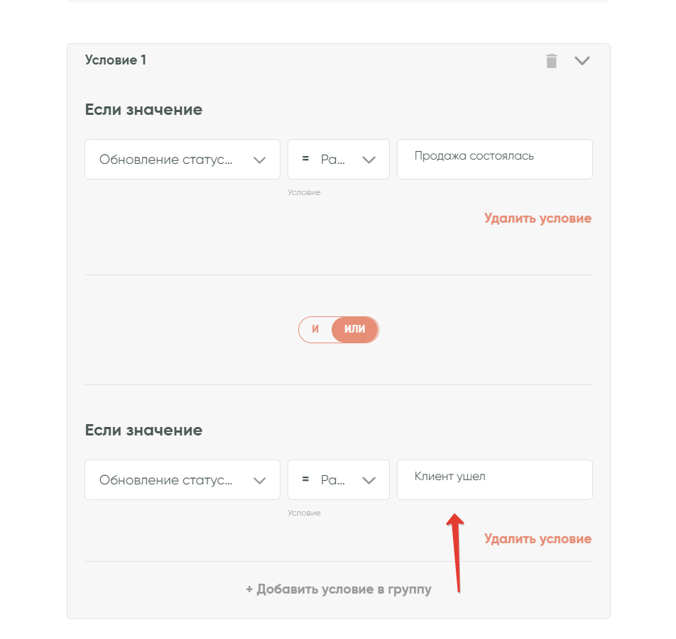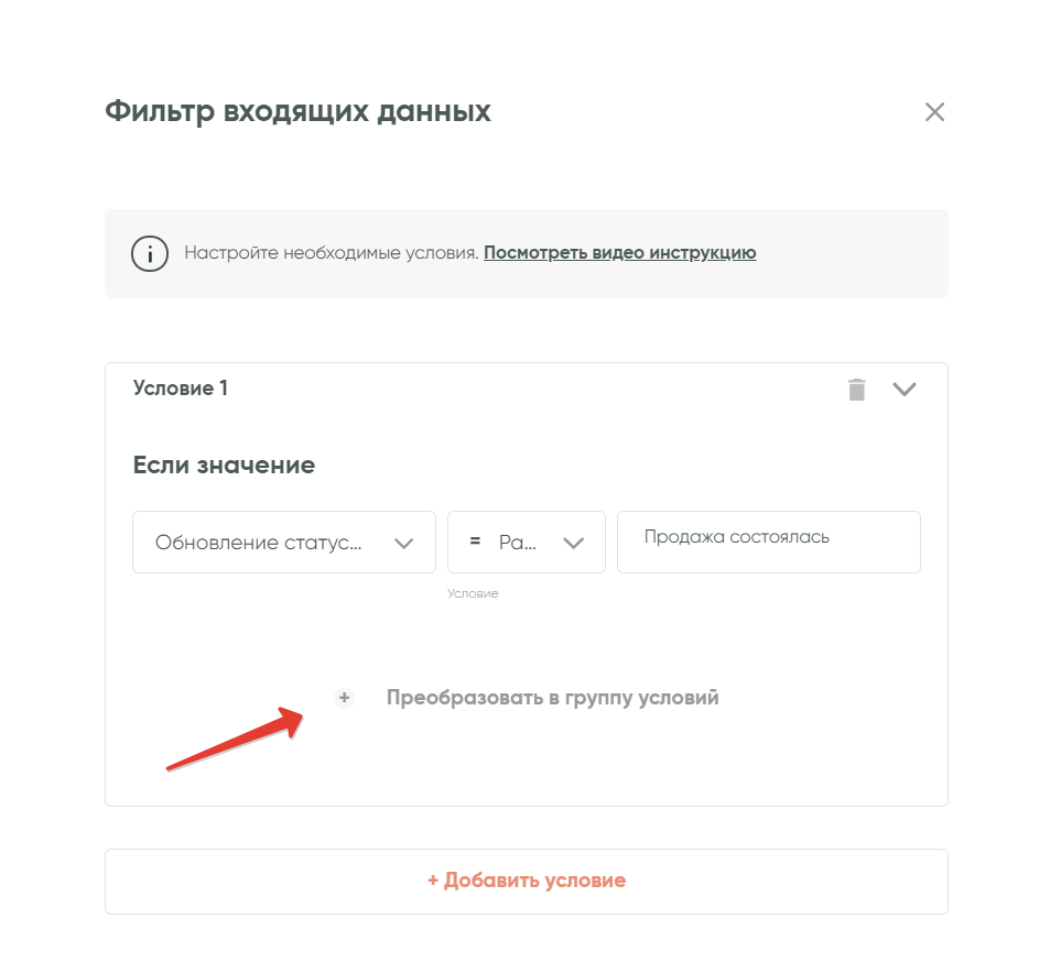 Нажимаем «Сохранить». Готово!Таким образом, связка продолжит работу только в том случае, если данные из передающего сервиса будут соответствовать указанному нами условию.Механизм проверки условия поддерживает также настройку сложных условий.Например, вы хотите, чтобы связка срабатывала при статусах сделки «Продажа состоялась» или «Клиент ушел». В этом случае можно преобразовать условие в группу условий: