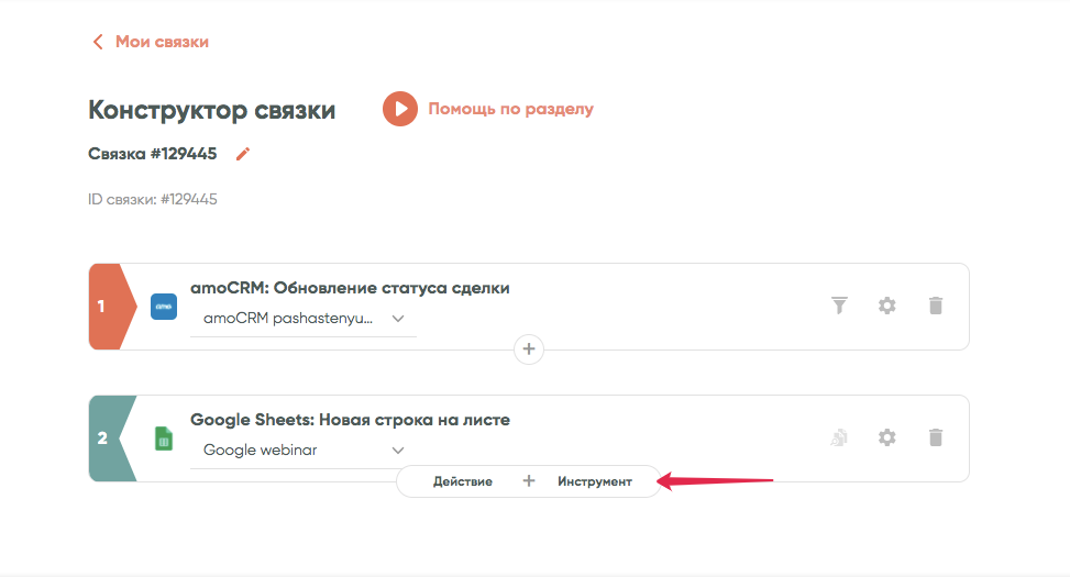 Добавьте инструмент через раздел «Конструктор связки» — нажмите на кнопку «+» и выберите раздел «Инструменты»:
