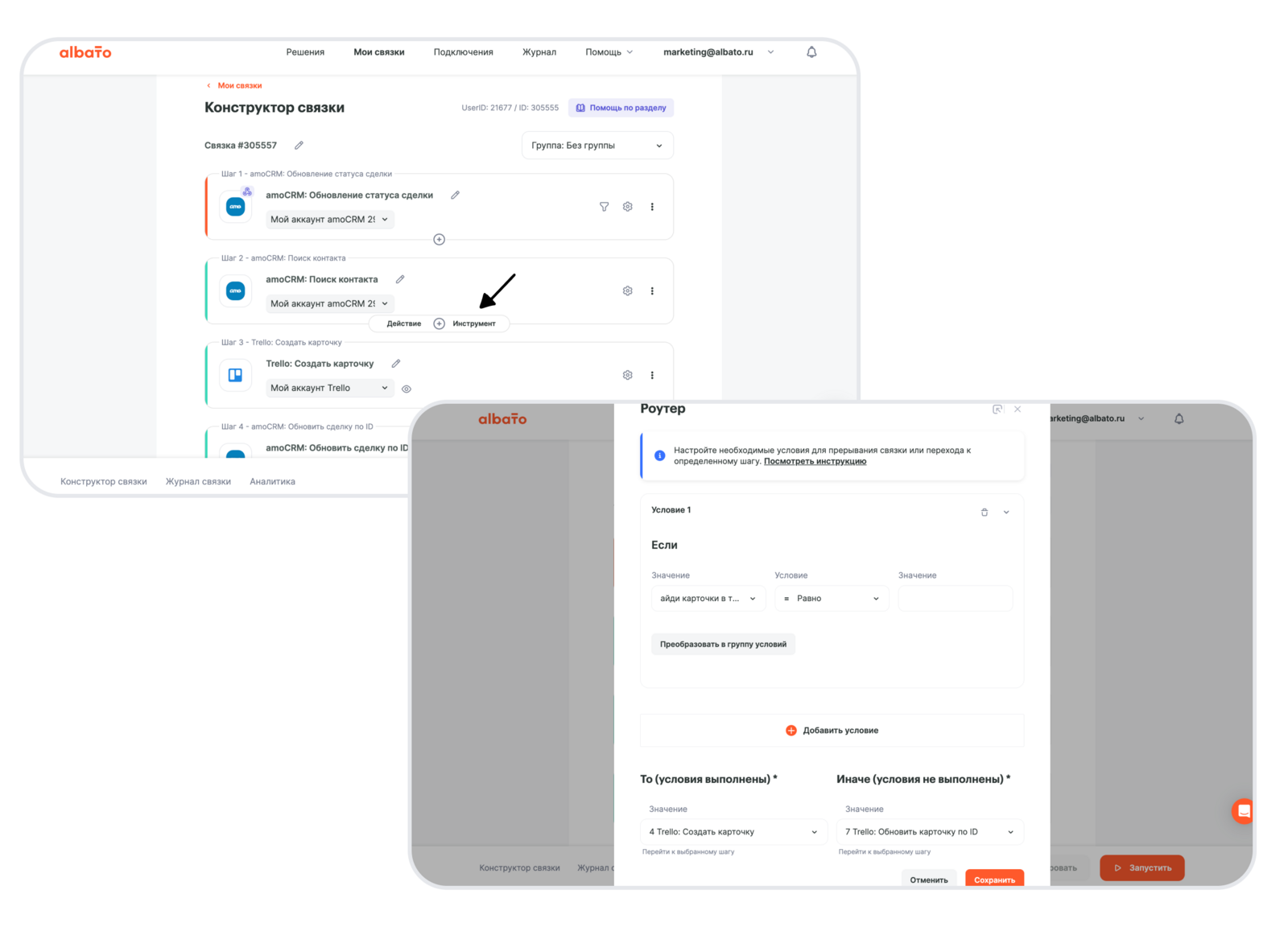 Последний шаг – добавление инструмента Роутер после шага amoCRM: Поиск контакта. Если поле, содержащее ID карточки в Trello пустое, то создаем новую карточку и обновляем сделку, иначе обновляем карточку.
