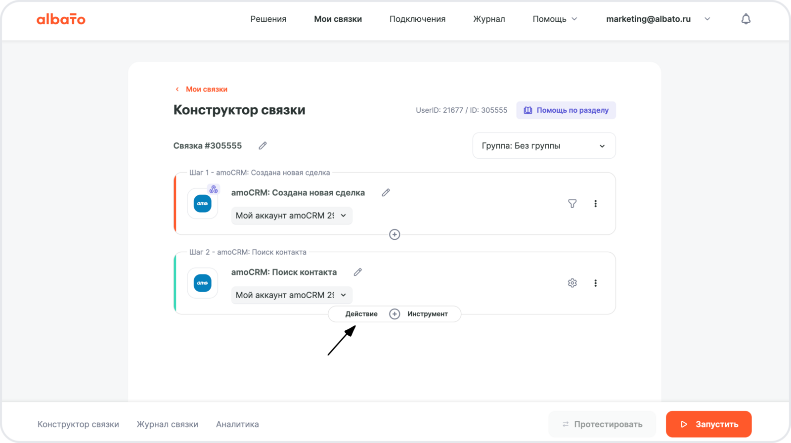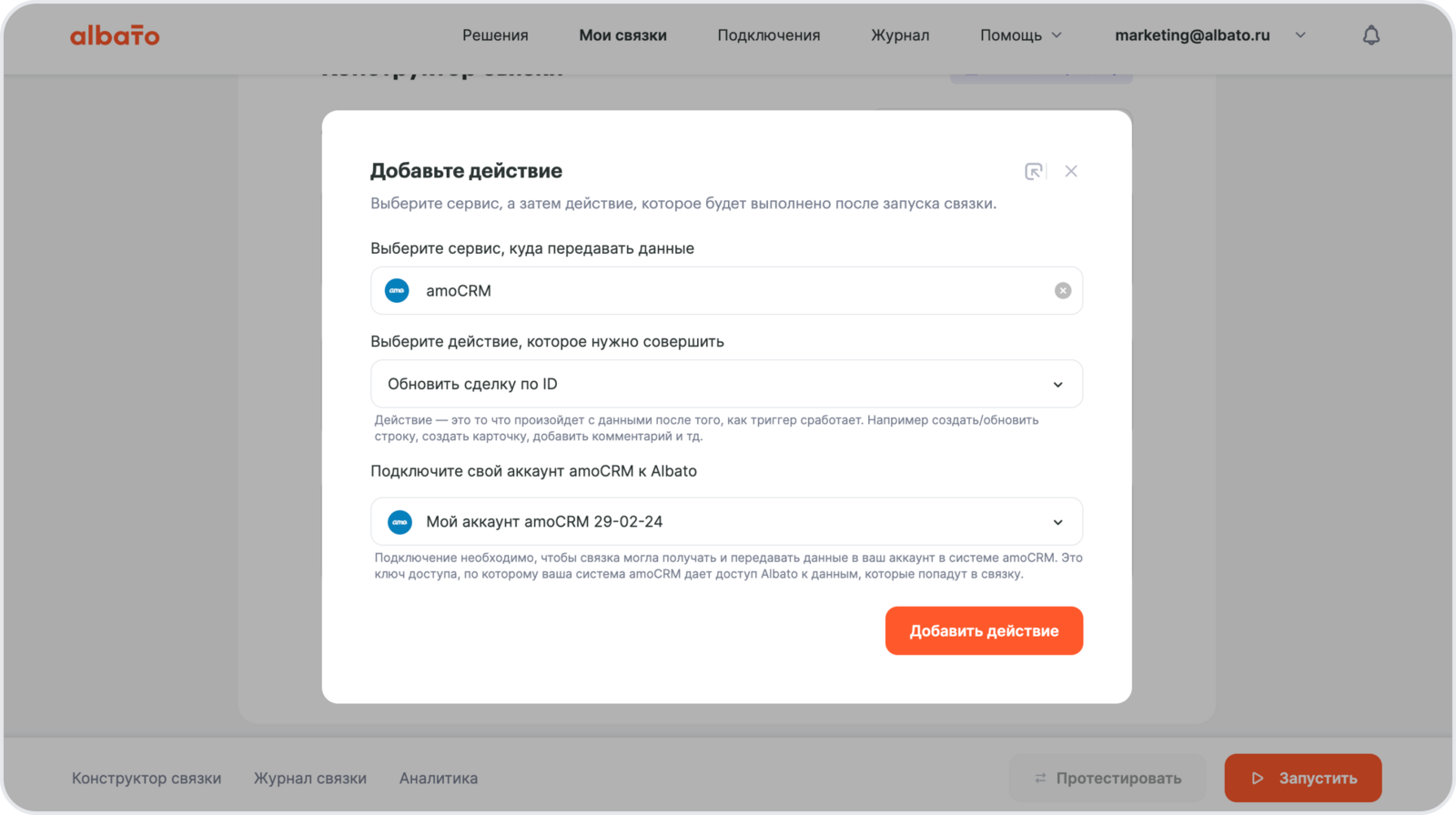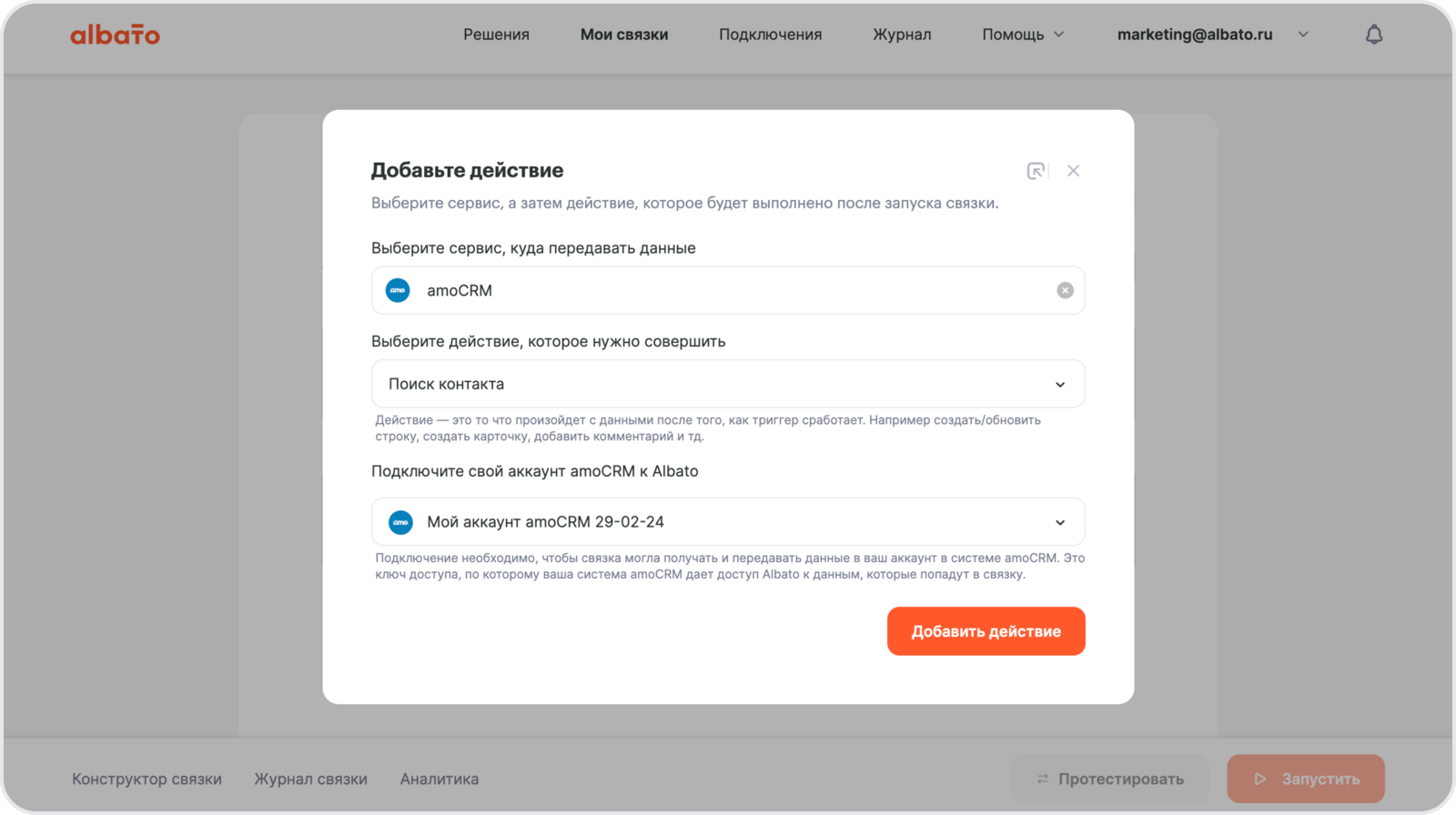 Действия — что делает Albato после запуска связки. Также действия позволяют передавать данные в другие сервисы и системы.