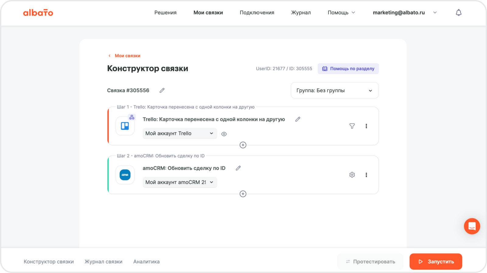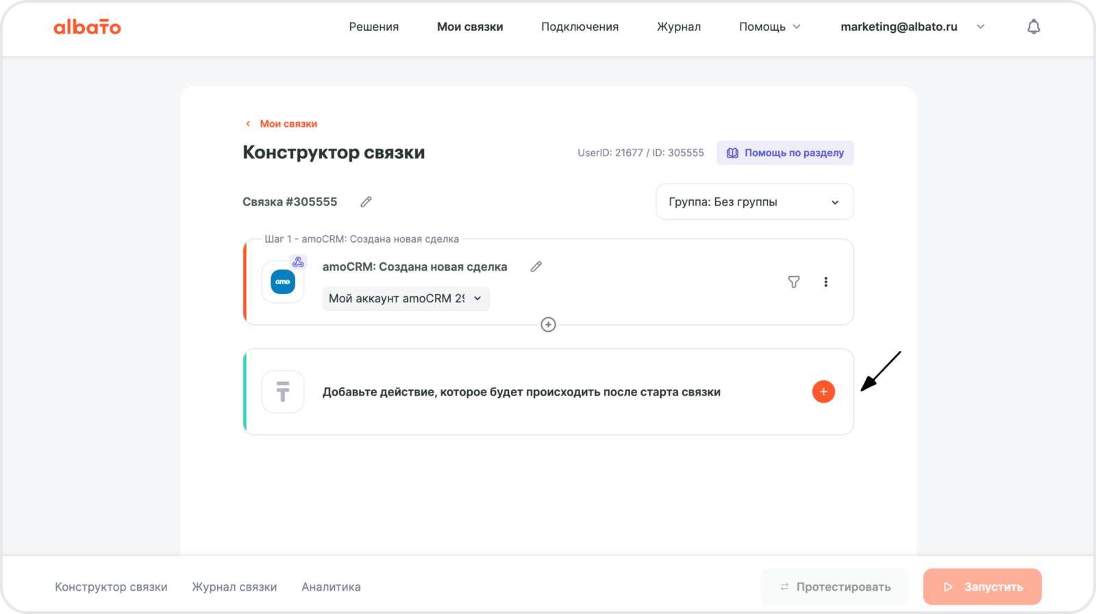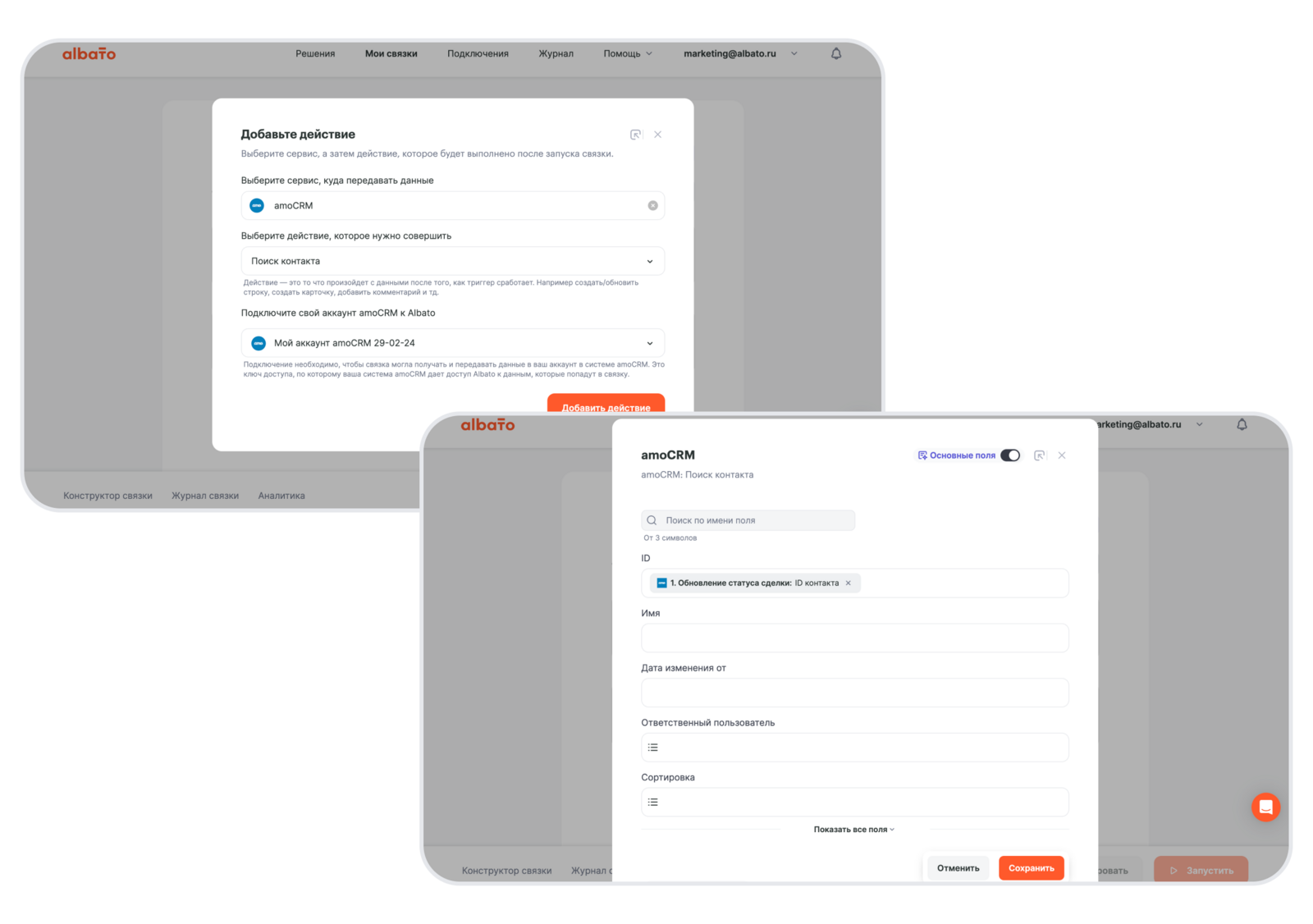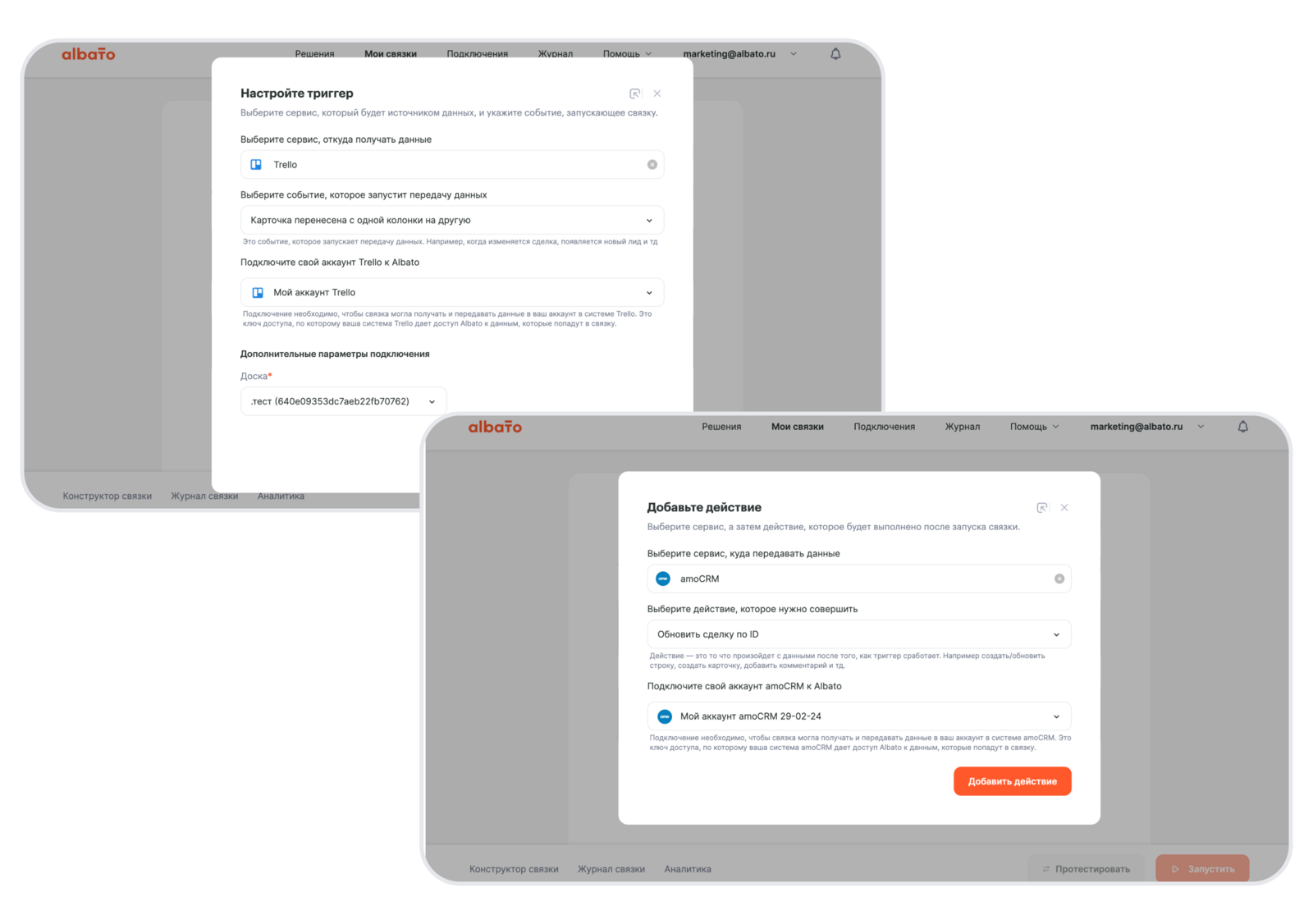Действия — что делает Albato после запуска связки. Также действия позволяют передавать данные в другие сервисы и системы.