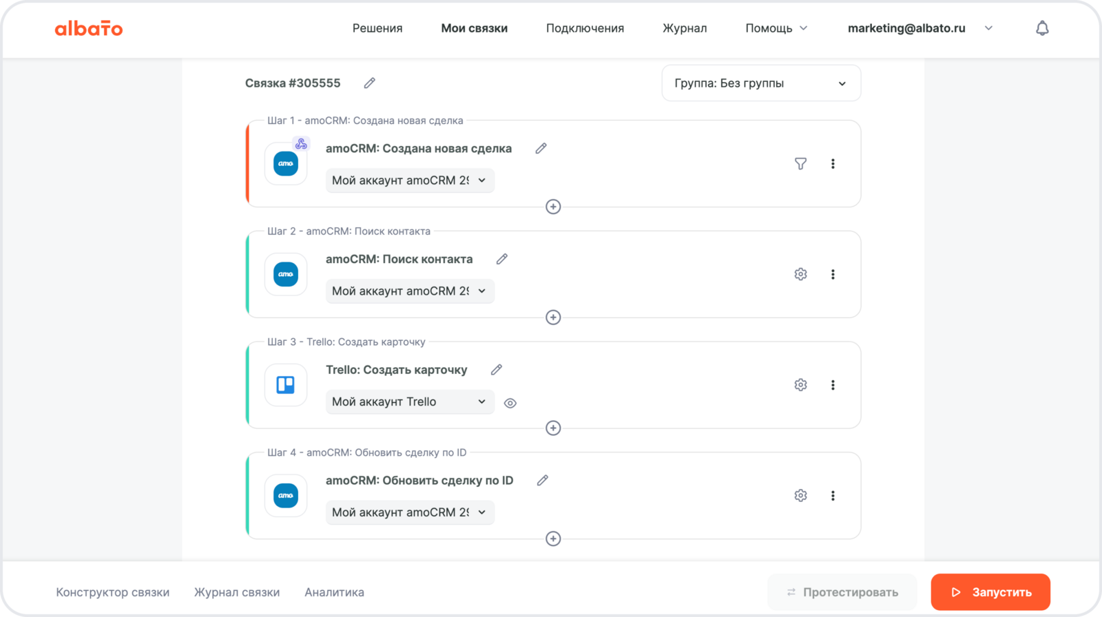 Для успешной интеграции потребуется настроить три связки. Они будут создавать новую карточку в Trello при добавлении сделки в amoCRM, обновлять статус сделки в amoCRM при переносе карточки в другую колонку Trello, и наоборот — обновлять информацию в Trello или создавать новую карточку при изменении статуса сделки в amoCRM.