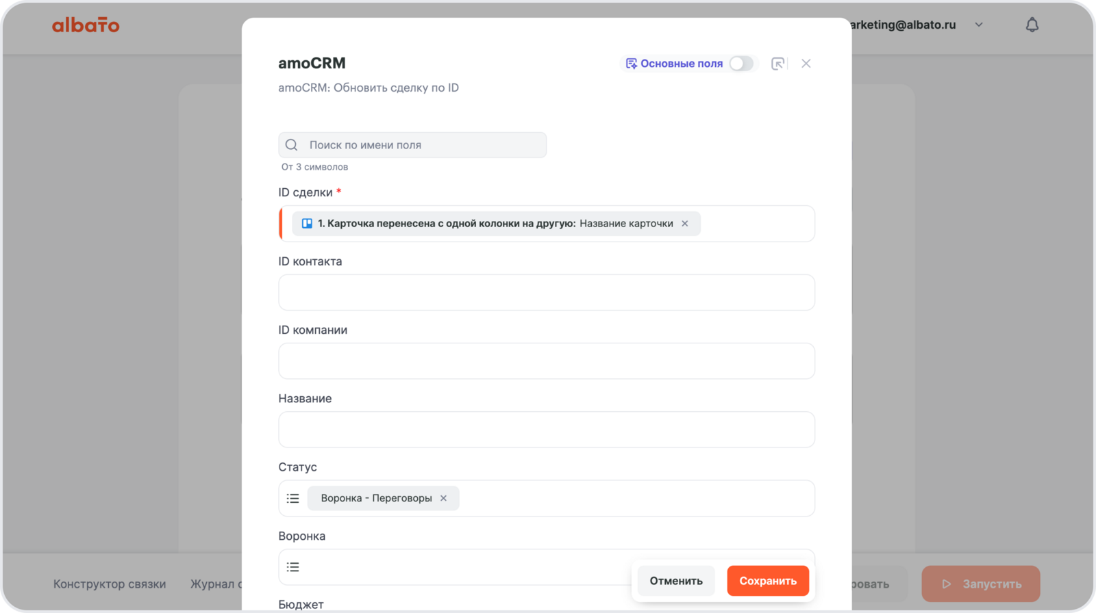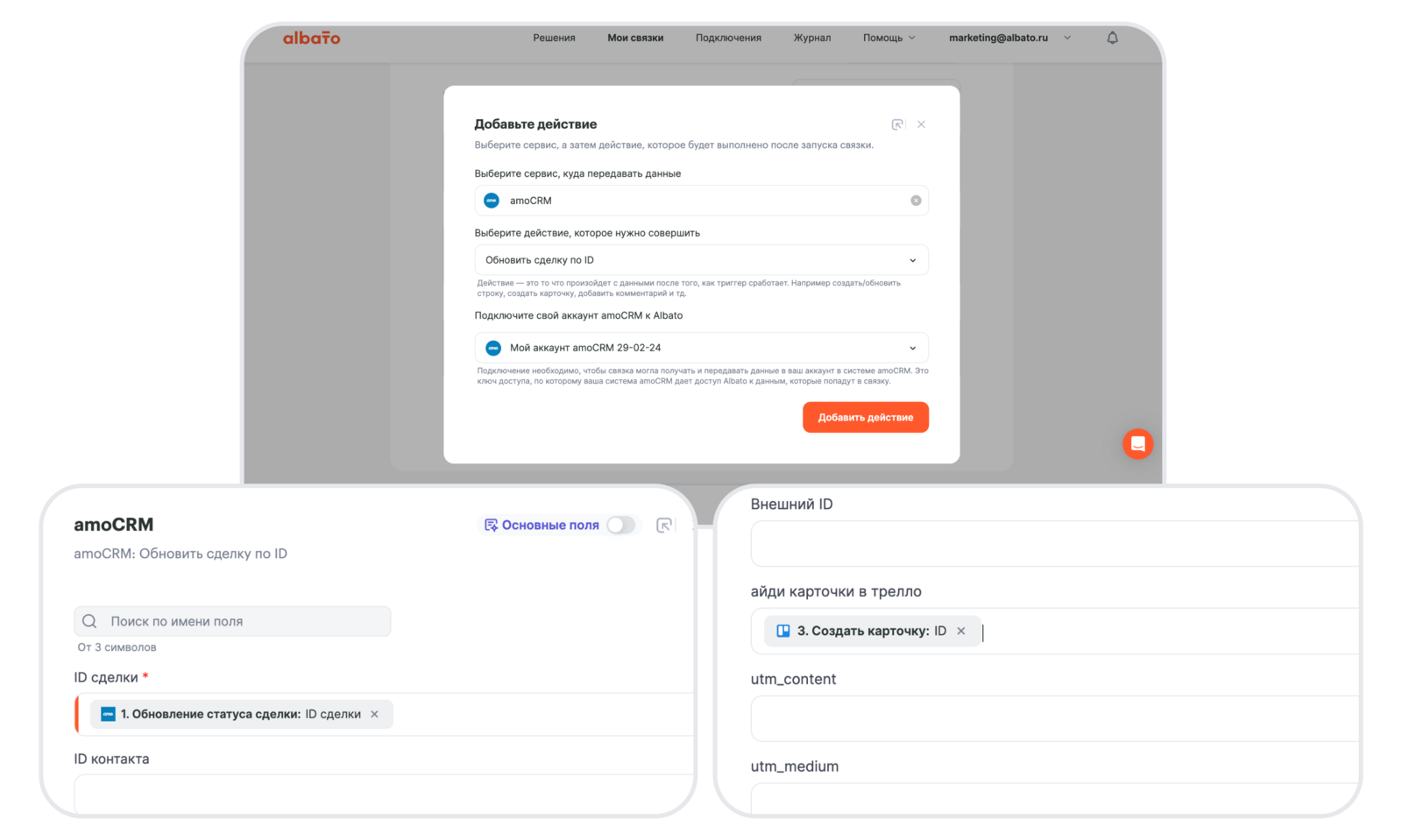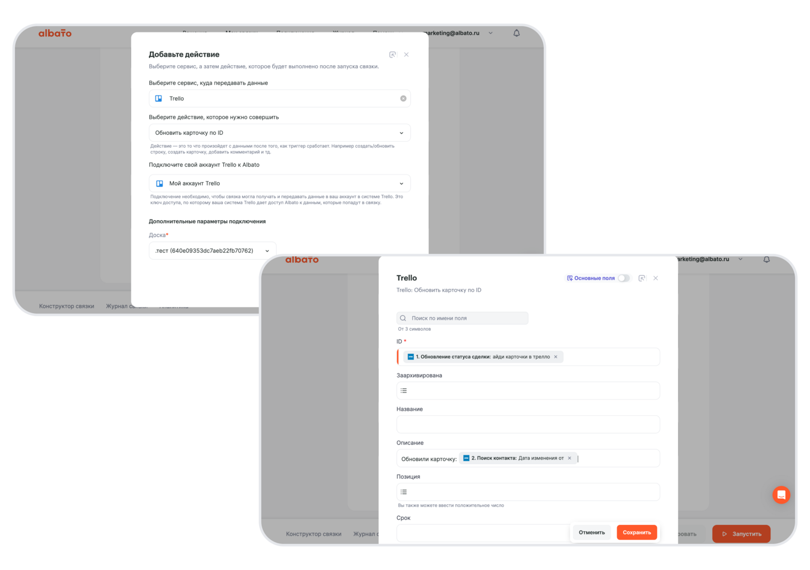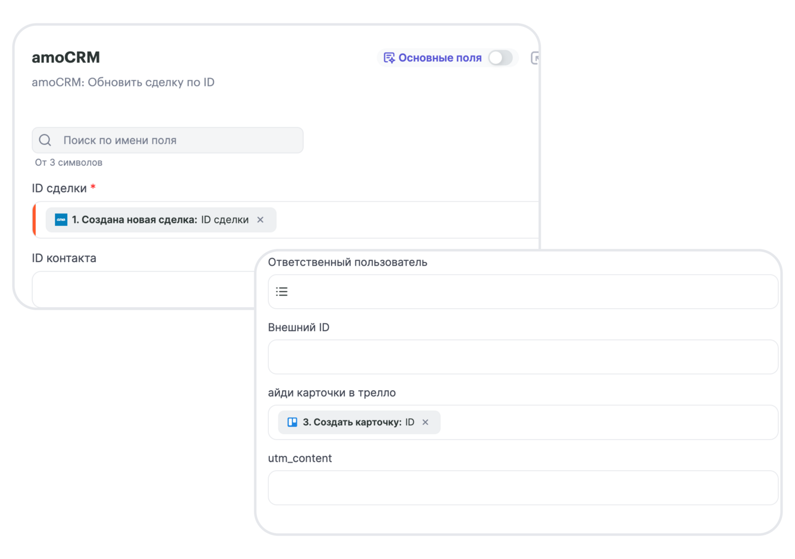 amoCRM: Обновить сделку по ID. Настраиваем поля: ID сделки выбираем параметр ID сделки из шага amoCRM: Обновление статуса сделки, в дополнительном поле указываем ID созданной карточки из шага Trello: Создать карточку.