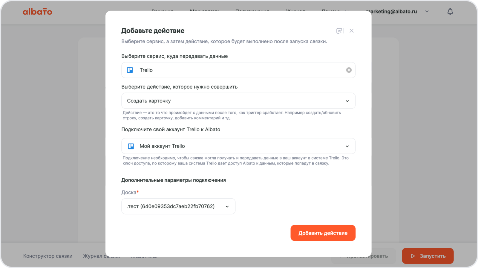 - Какое действие выполнить, когда запустится связка — Создать карточку.