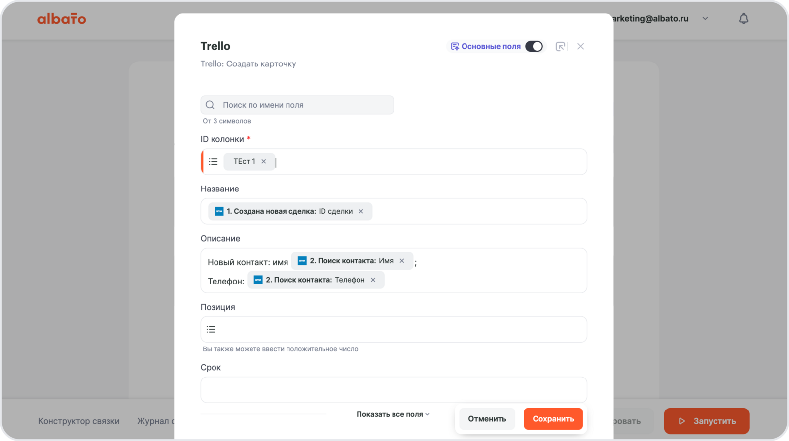 Trello: Создать карточку. Заполняем поля: название карточки – параметр ID сделки из amoCRM: Обновление статуса сделки, остальные можно заполнить параметрами из сделки или найденного контакта