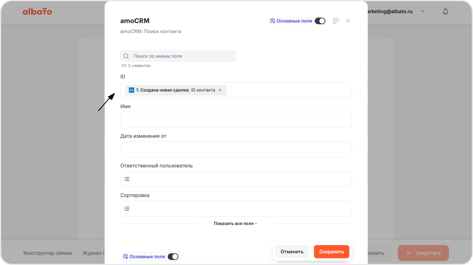 Теперь мы переходим к настройке следующего шага. Здесь необходимо заполнить только одно поле – ID контакта, который мы получили на предыдущем шаге.