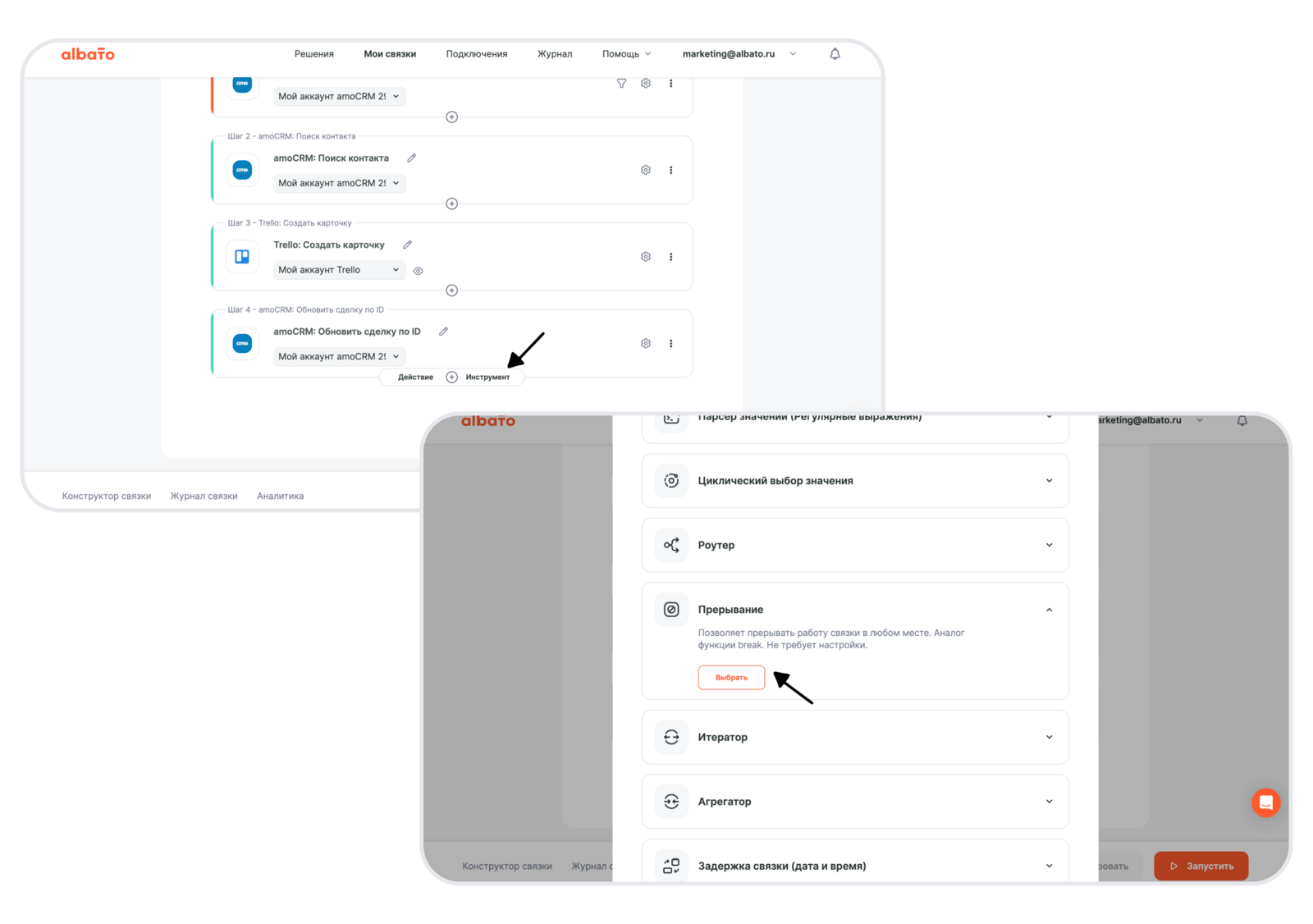 Инструмент – Прерывание. Данный инструмент останавливает работу связки в том месте, куда он добавлен. Настройка не требуется.