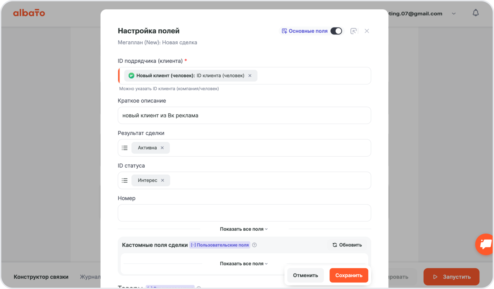 - В поле ID подрядчика (клиента) выбери параметр из выпадающего списка Мегаплан – новый клиент.