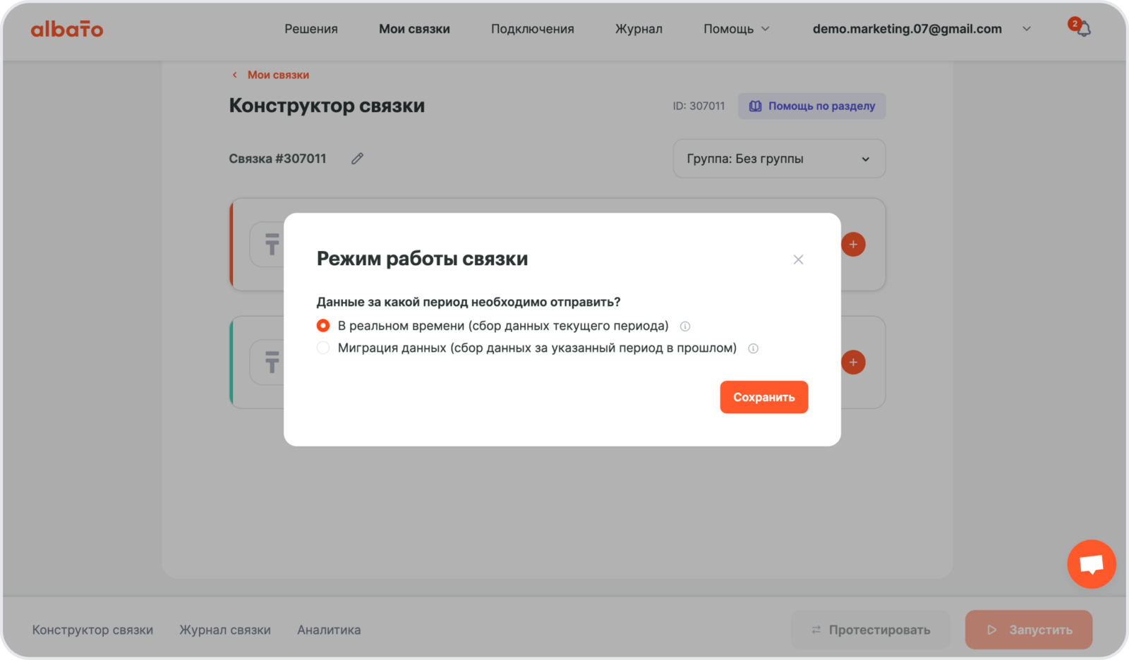 Далее выбери режим работы связки — В реальном времени (после запуска связки, все новые лиды будут передаваться в CRM).