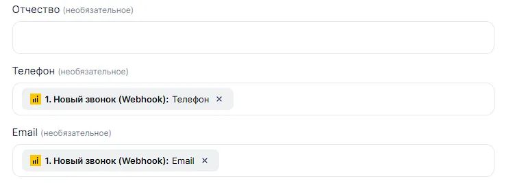 Пример заполненной связки (поле фамилия обязательное, но так как Callibri не присылает фамилию, мы туда вставим имя повторно, либо поставим прочерк, но поле обязательно должно быть чем то заполнено):