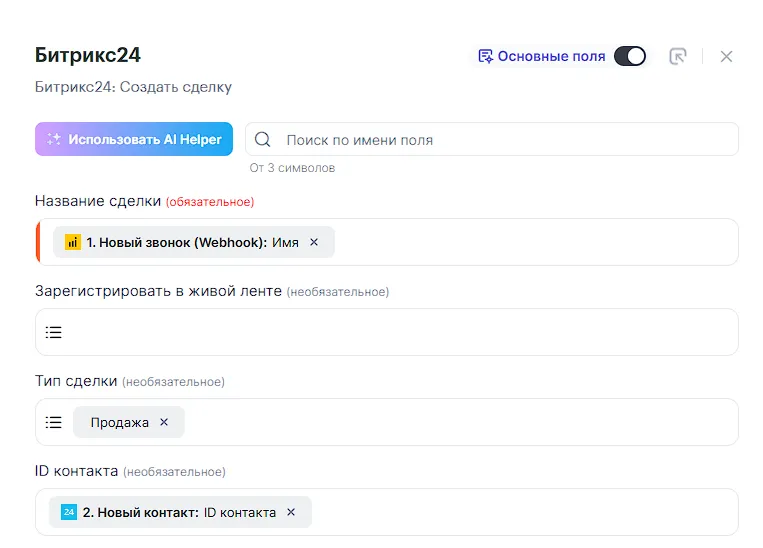 По аналогии с настройкой полей контакта, так же настраиваем поля сделки. Важно! Поле ID контакта обязательно нужно заполнить параметром от Битрикс24 “ID контакта”, это нужно что бы сделка привязалась к созданному контакту.