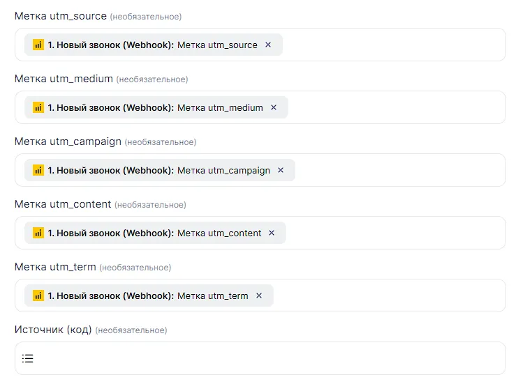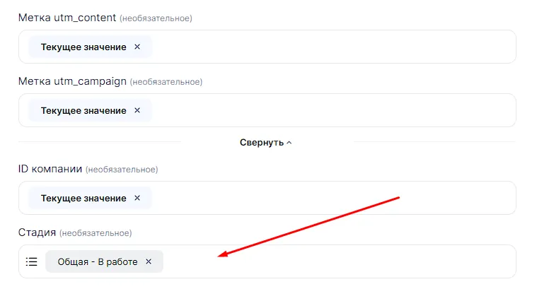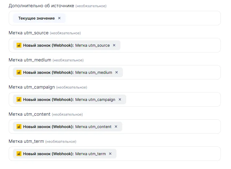 Теперь вы выбираете, что делать с полями в случае нахождения дубликата и его обновления. Если стоит макрос “Текущее значение”, то тогда поле в контакте не изменяется. Можно убрать макрос и поставить какое-либо значение из Callibri, что ы изменить поле. Например, мы в случае нахождения дубликата, напишем в поле “Комментарий контакта” комментарий из Callibri, а также пропишем utm-метки от Сallibri.