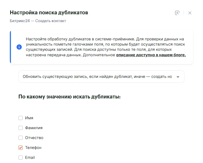 Нажимаем сохранить, и также настраиваем обработку дубликатов, тут важно поставить галочку на ID контакта, остальные опционально (в случае если галочек проставлено несколько, то поиск осуществляется с оператором И)