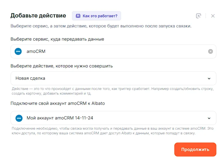 Перед созданим связки убедитесь, что оба сервиса подключены к Альбато.