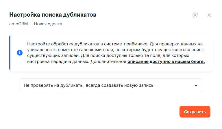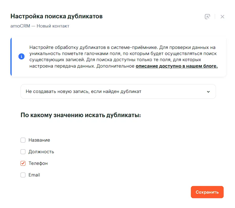 Настраиваем проверку на дубли, будем проверять по номеру телефона, если контакта с таким номером нет, будет создан новый контакт: