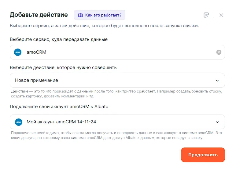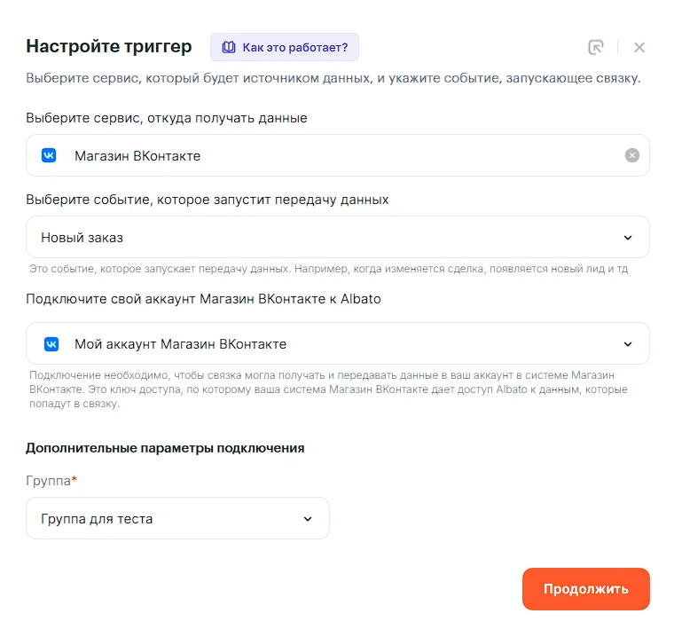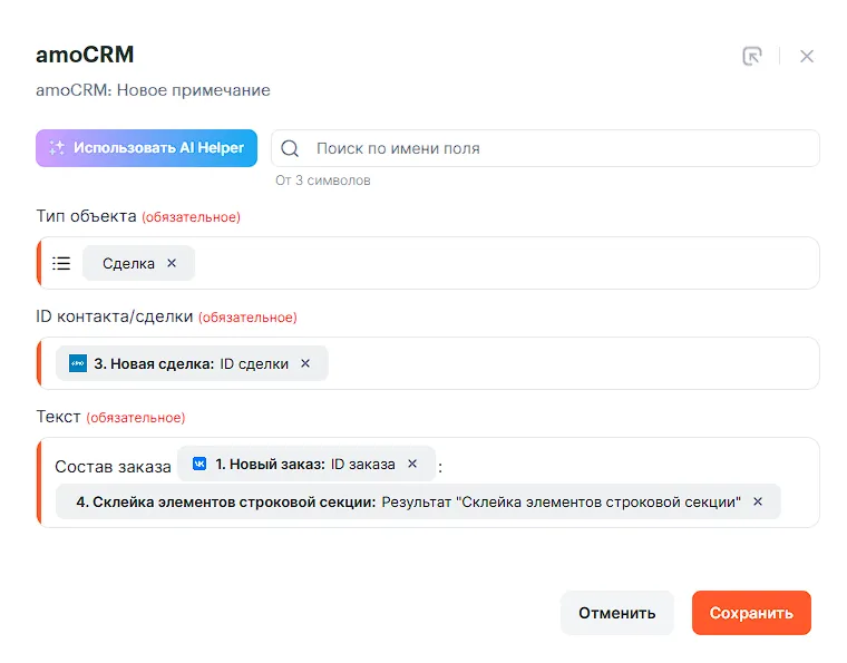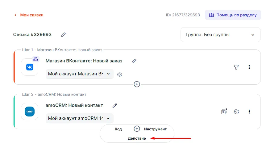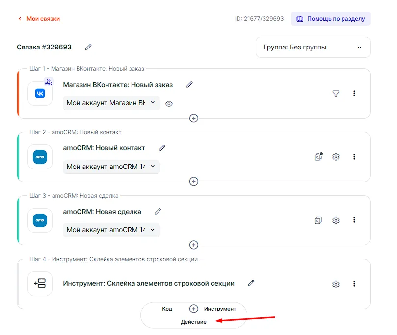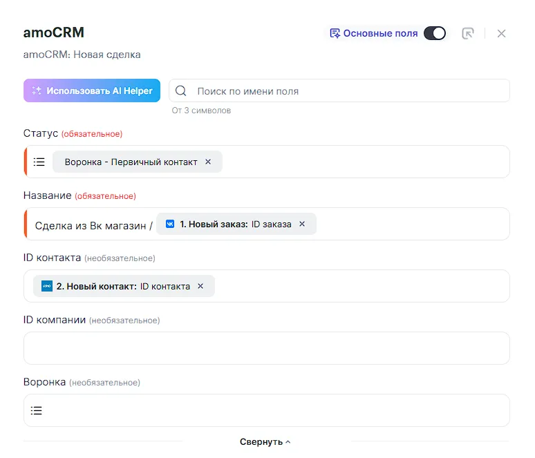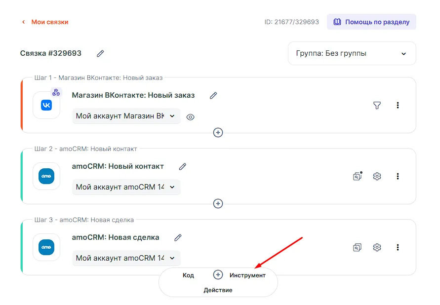 В данной инструкции рассмотрим пример создания связки, которая будет создавать в amoCRM контакт, сделку и примечание с составом заказа из Магазина Вконтакте.