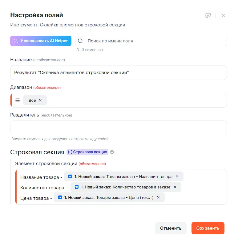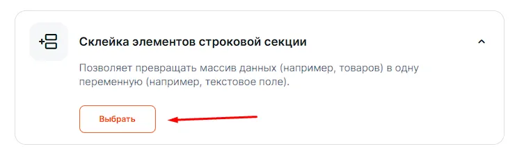 Товары из Магазин ВКонтакте приходят в массиве, поэтому добавляем в связку инструмент Склейка элементов строковой секции: