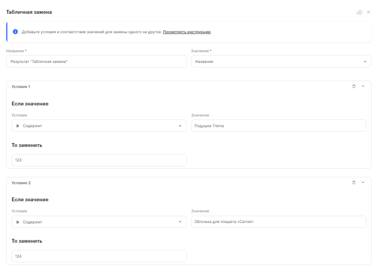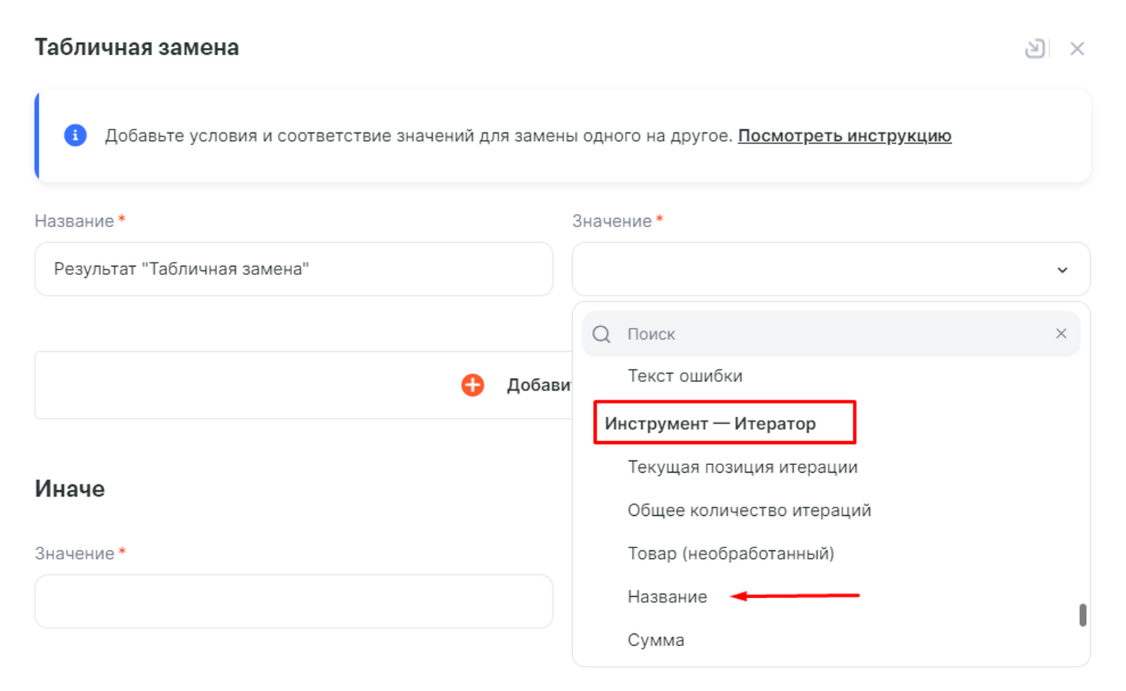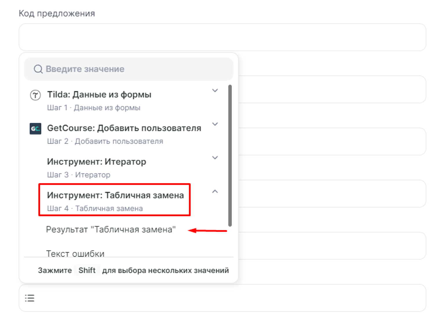 Переходим к следующему шагу, добавляем еще один инструмент Табличная замена, в нашем примере мы будем сопоставлять Название товара в Tilda и Код предложения в GetCourse: