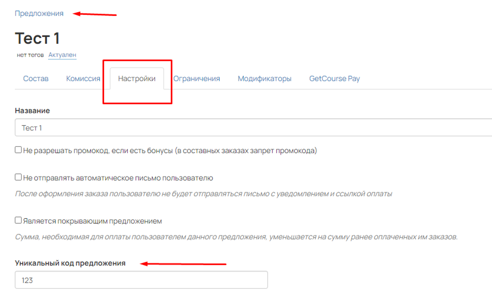 Далее, каждому товару в Tilda будет соответствовать свой код предложения в GetCourse: