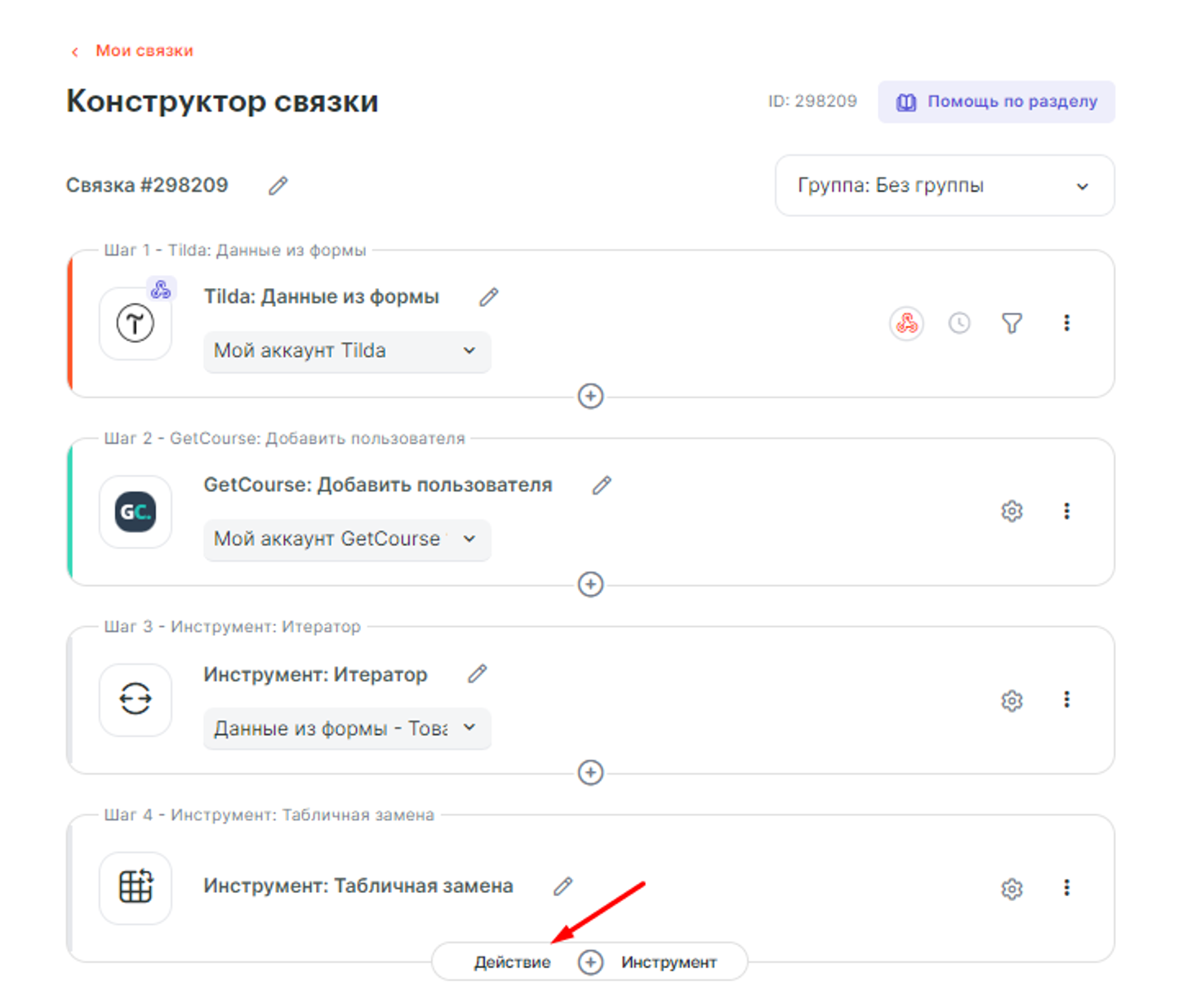 Cохраняем, далее добавляем еще один шаг в связку:
