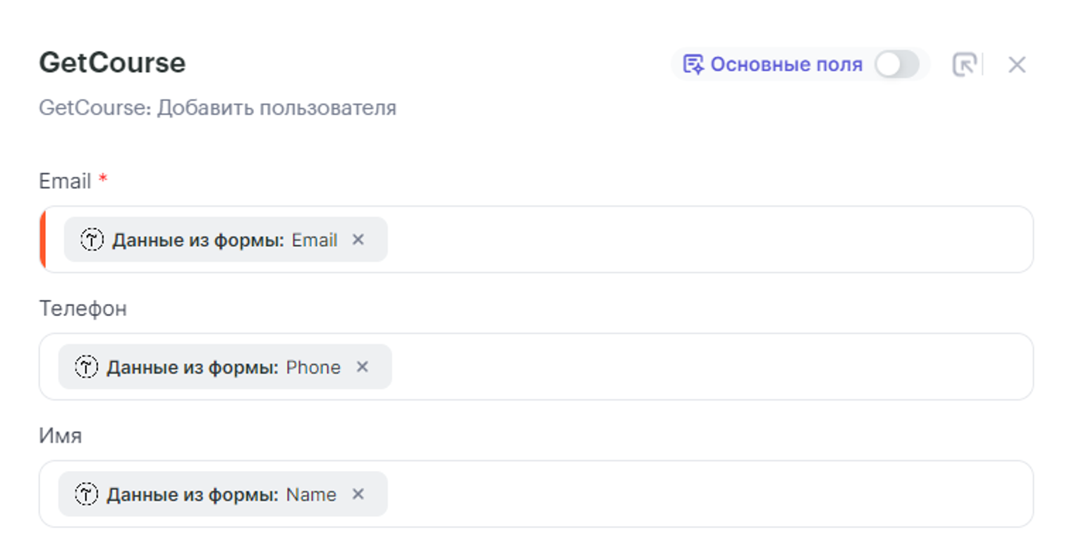- Email, Телефон и Имя — соответсвующими параметрами из шага 1 Tilda