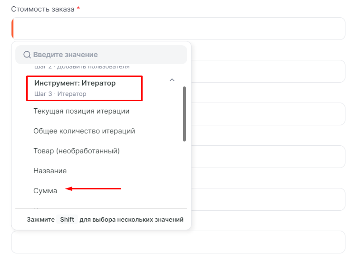 Стоимость заказа — результат работы инструмента Итератор, параметр Сумма