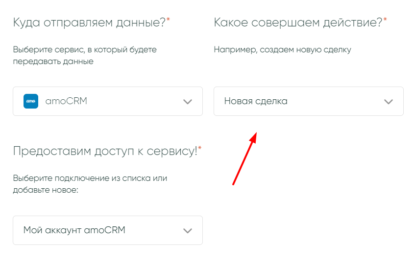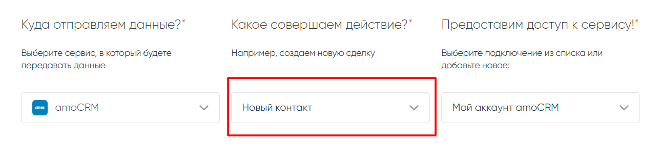 Теперь настроим сервис, куда мы будем передавать данные. В нашем случае все данные будут приходить в amoCRM, а действием будет «Новый контакт». Укажите также свое подключение сервиса.