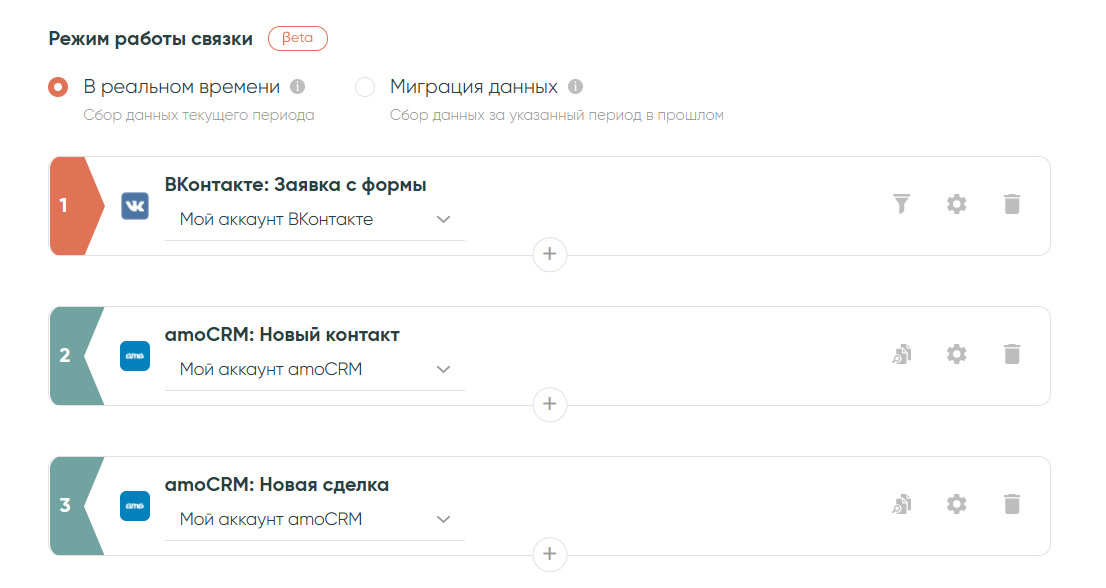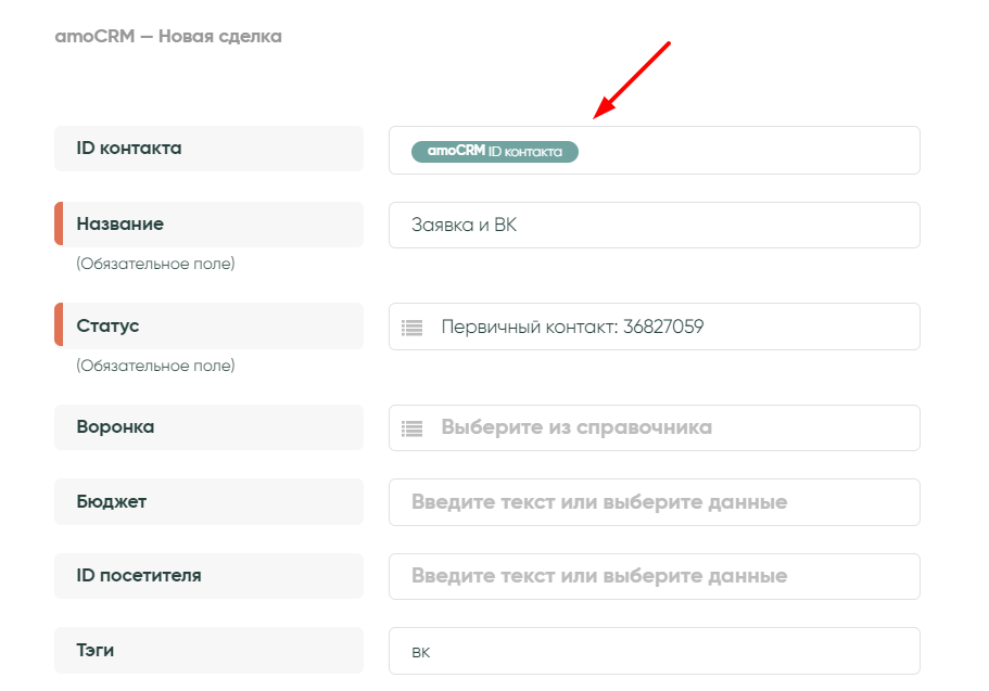 В этой инструкции мы создадим связку, которая будет передавать данные из Формы сбора заявок ВКонтакте в amoCRM с созданием «Контакта» и «Сделки».