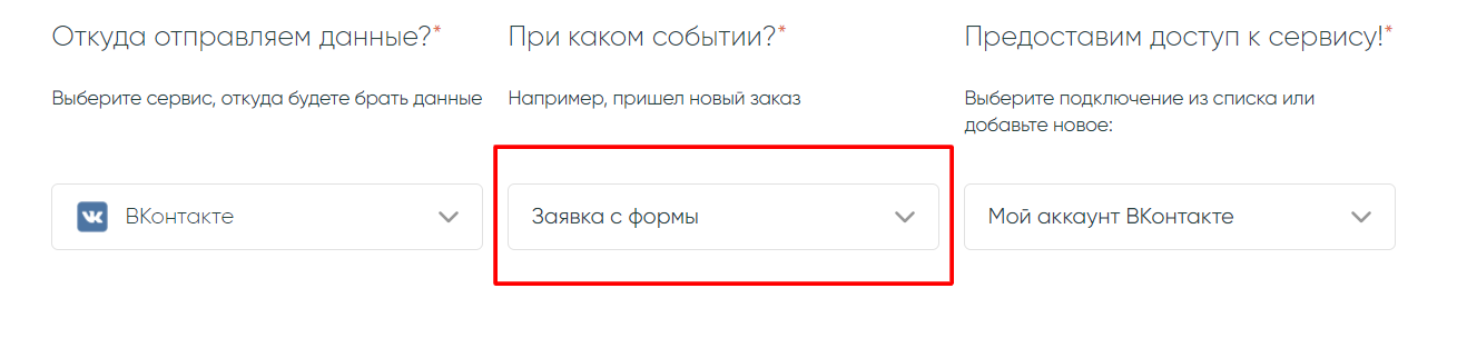 На новом экране нам нужно настроить сервис, откуда мы будем забирать данные. В нашем случае это будет ВКонтакте с действием «Заявка из формы», также укажите свое подключение сервиса.