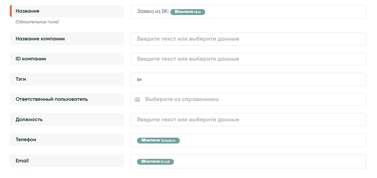 Теперь заполним поля. Здесь можно выбрать параметры из выпадающего списка от ВК, а так же прописать статично (вручную). Не забывайте заполнять поля Телефон и Email, чтобы в дальнейшем можно было поставить проверку на дубли по нужному параметру. Также, при необходимости, можно вписать Тег, выбрать ответственного и т.д.