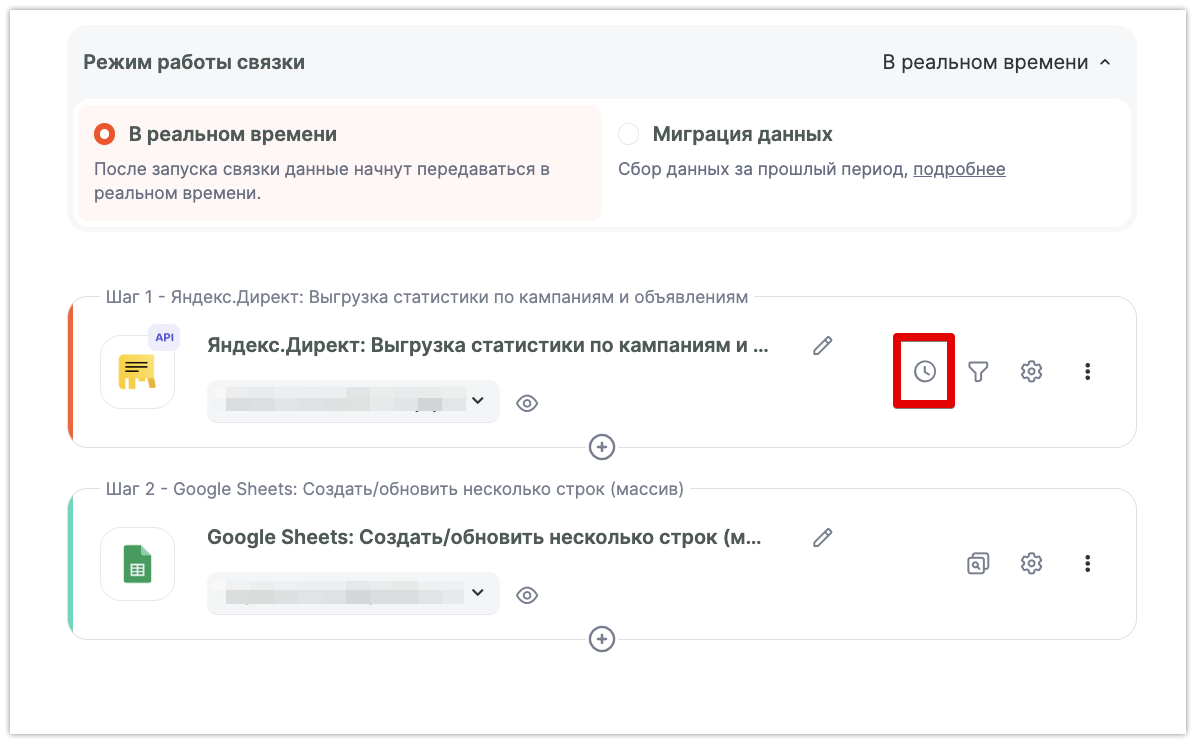 Связка готова, осталось настроить график выгрузки, для этого на первом шаге выбираем График запуска: