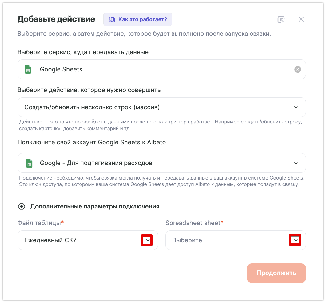 • Файл таблицы и лист – соответственно те, куда будет идти выгрузка