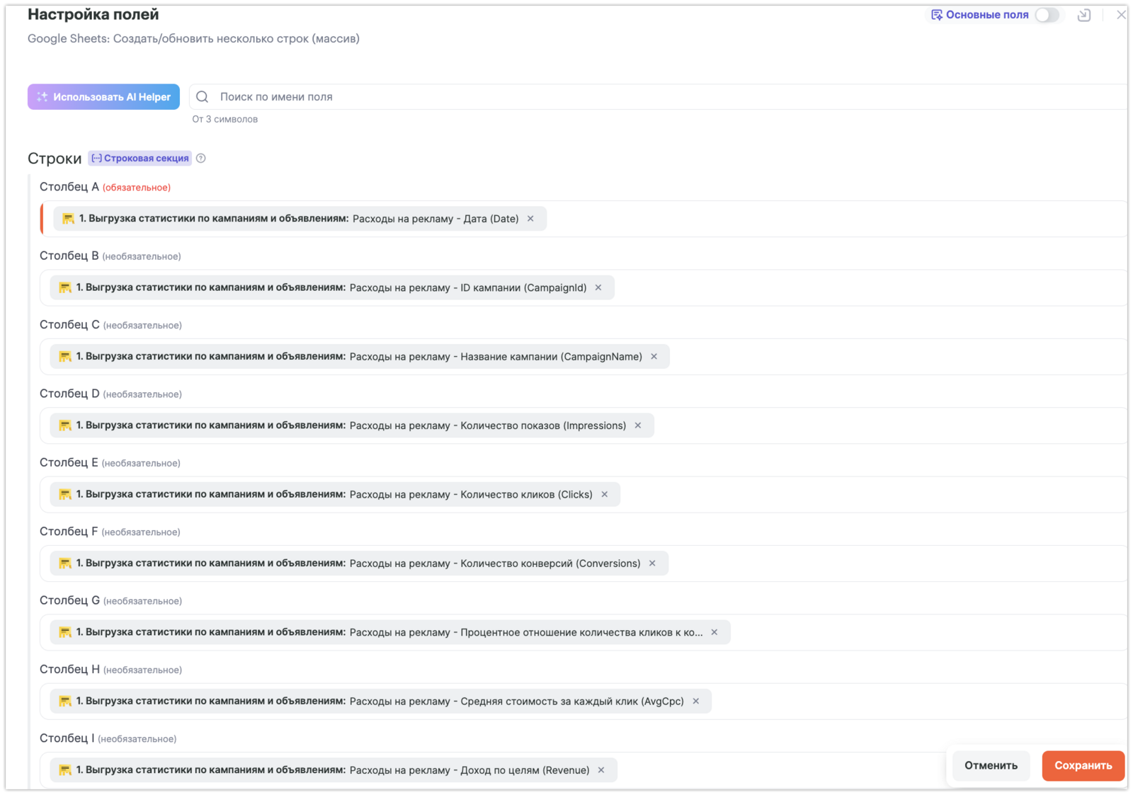 Настройка полей таблицы, столбец А должен быть заполнен обязательно, остальные столбцы заполняются параметрами из списка Яндекс.Директ.