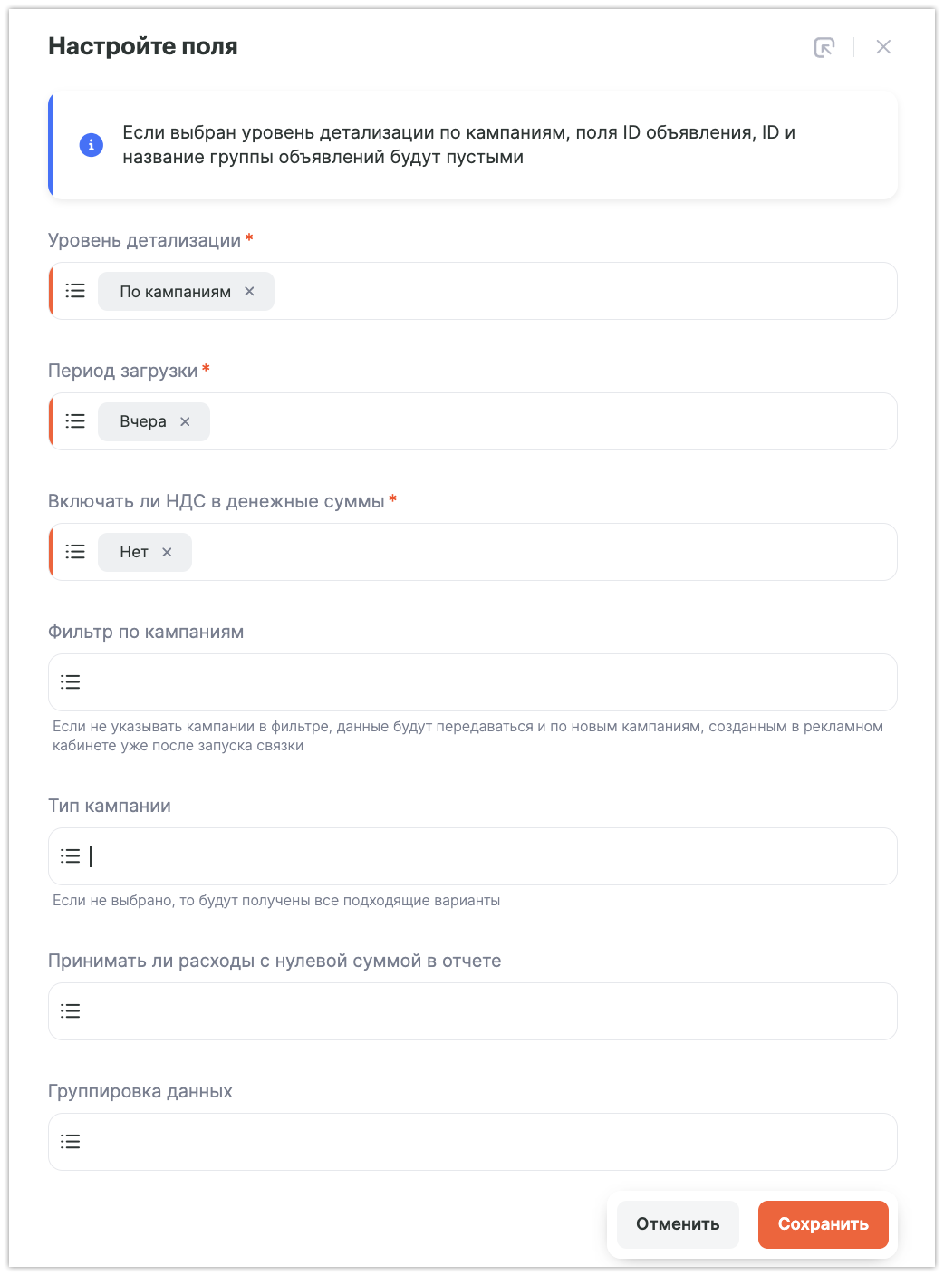 • Фильтр по кампаниям – выбираем из списка те, для которых нужна передача данных. Если нужно передавать из всех кампаний – оставляете поле пустым.