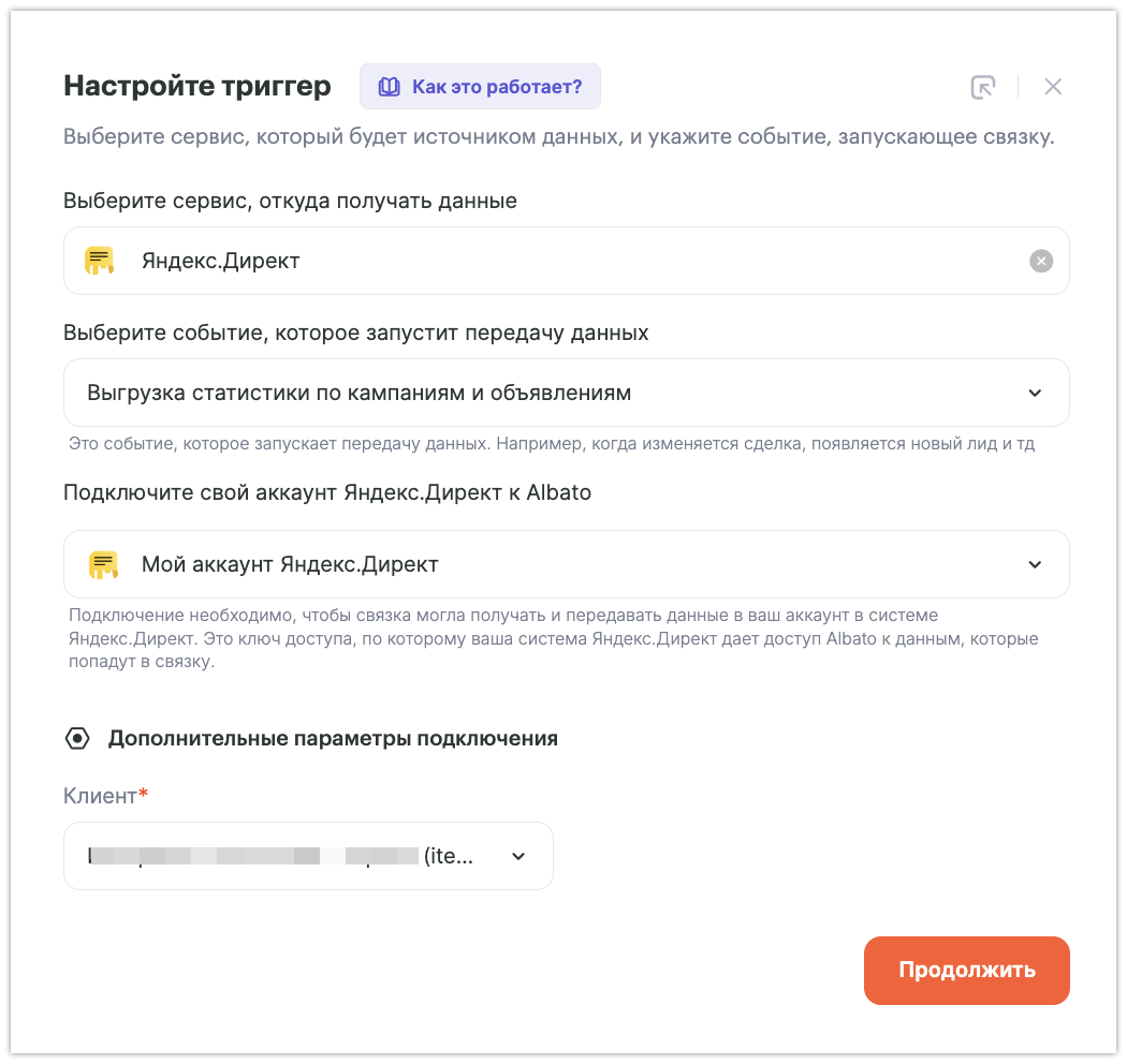 • Клиент – выбираем из доступных значений (для каждого клиента будет своя связка).