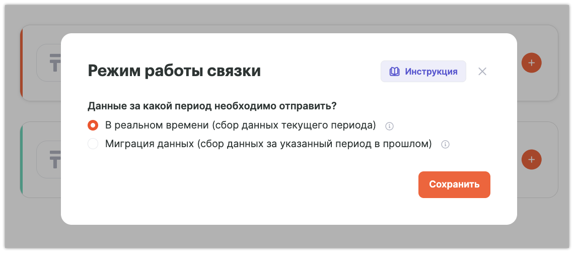 Далее нужно выбрать режим работы связки, в данном случае передача данных в реальном времени: