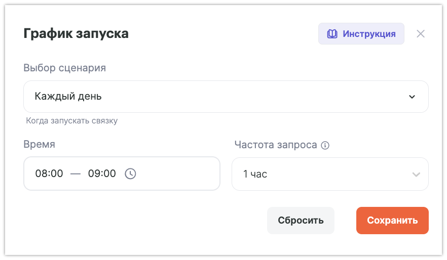 В появившемся окне можно настроить удобный график работы, в нашем примере связка будет выгружать данные 1 раз в день с 8 до 9 утра, настройка приведена ниже: