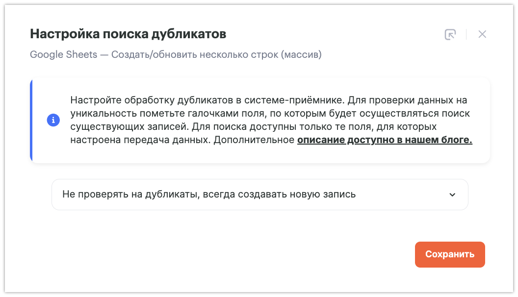 В данном кейсе выбираем Не проверять дубли, всегда создавать новую запись, при этом сценарии всегда будет добавлять новая строка в таблице, подробнее о других сценария можно прочитать тут.