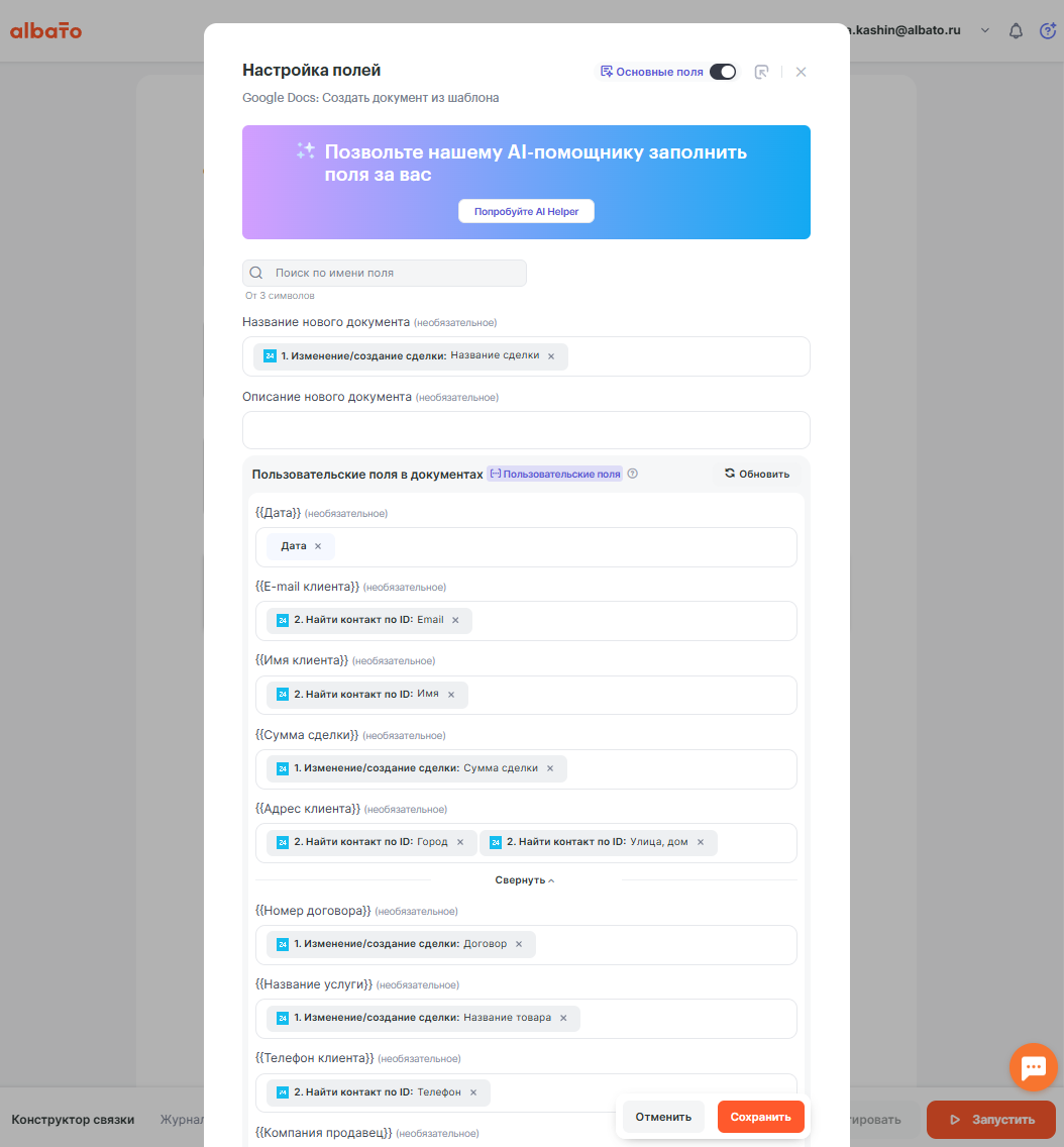 Теперь когда связка настроена для получения всех необходимых данных из Битрикс24 мы приступаем к настройке последнего Шага. Добавляем Шаг с сервисом Google Docs в котором выбираем действие “Создать документ из шаблона”, а в поле “Документы” блока Дополнительные параметры подключения выбираем тот шаблон который будем использовать в связке (шаблон должен быть подготовлен заранее).
