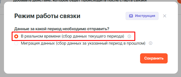 Режим работы связки выбирает В реальном времени (сбор данных текущего периода)