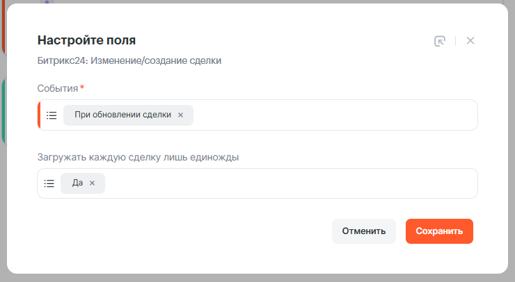 Далее в поле События **выбираем **При обновлении сделки, чтобы получать данные когда сделка обновится, а в поле “Загружать каждую сделку лишь единожды” выбираем значение Да.