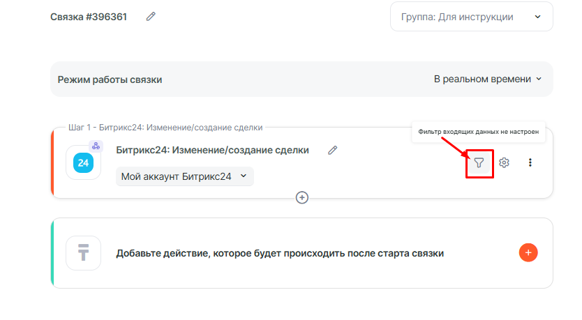 Сразу же настроим Фильтр входящих данных на первом шаге, чтобы данные в связку поступали только на стадии Подготовка документов