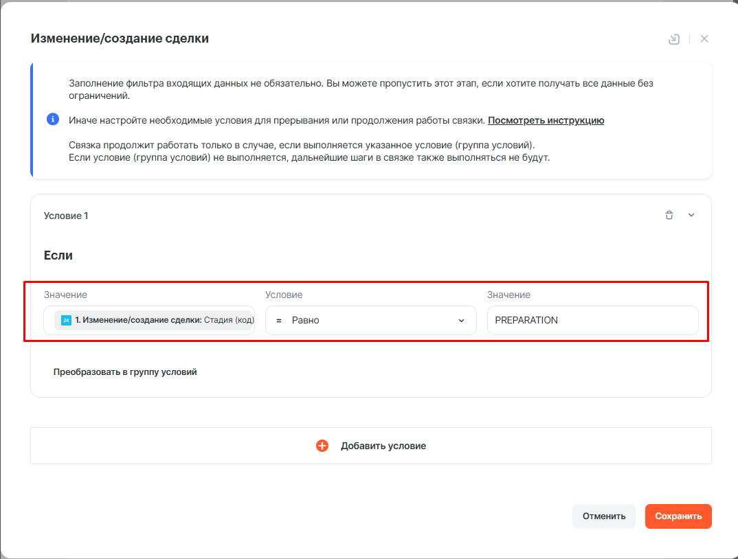 Для этого добавляем новое условие нажатием на кнопку Добавить условие, а далее заполняем поля нужными нам данными (код вашей стадии сделки вы можете посмотреть на вкладке Направления сделки в вашем подключении Битрикс24)