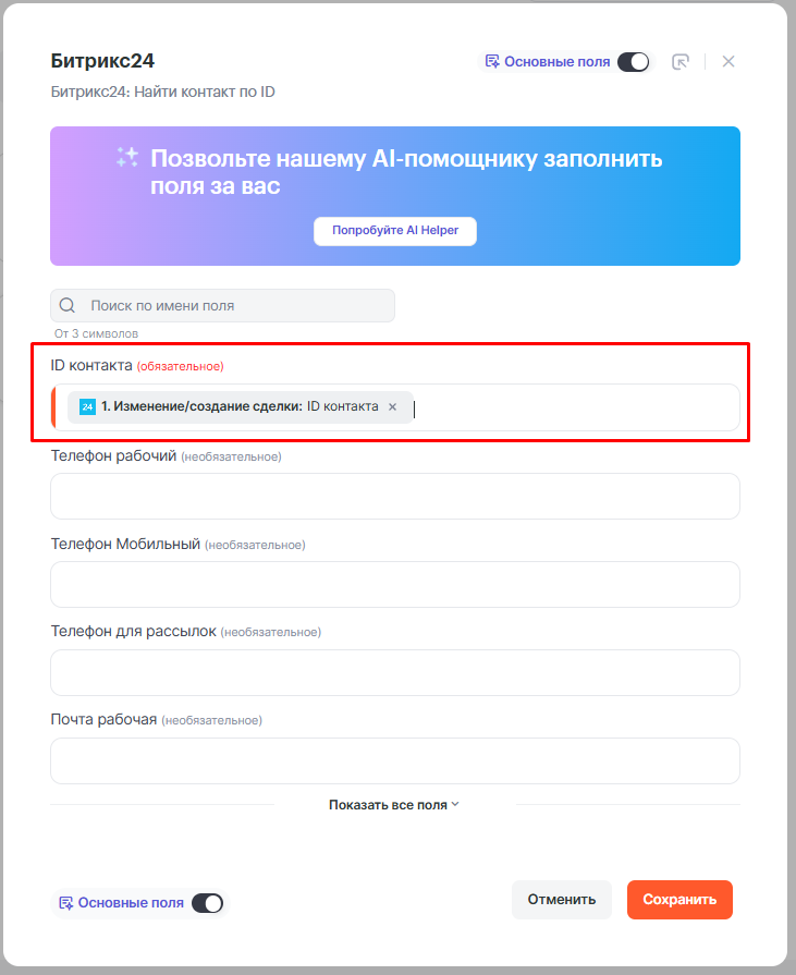 В этом шаге мы заполняем поле ID контакта данными из первого шага, а именно параметром ID контакта